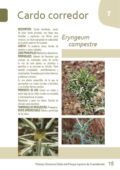 PROPIEDADES: Además de favorecer que crezcan las codiciadas setas de cardo, la raíz de esta planta, es diurética y aperitiva si se consume en infusión. Tiene también propiedades antiinflamatorias y cicatrizantes. Se emplea para tratar diversos problemas urinarios.