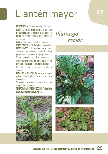 DESCRIPCIÓN: Hierba perenne. Sus hojas, ovaladas, con un largo peciolo, se disponen en una roseta en el suelo de la que salen los tallos, que portan pequeñas flores agrupadas en espigas.