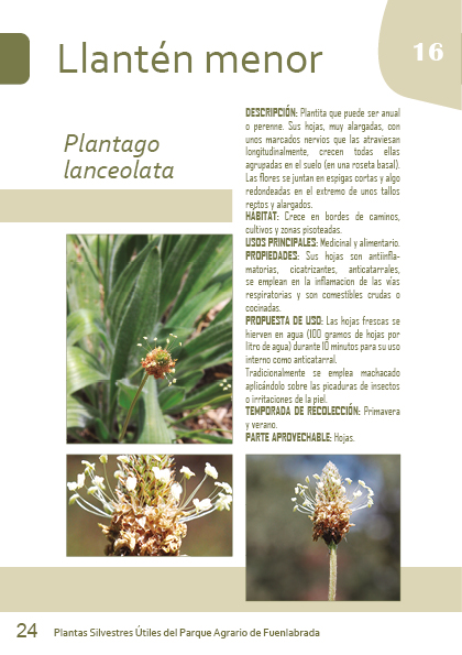 PROPUESTA DE USO: Las hojas frescas se hierven en agua (100 gramos de hojas por litro de agua) durante 10 minutos para su uso interno como anticatarral. Tradicionalmente se emplea machacado aplicándolo sobre las picaduras de insectos