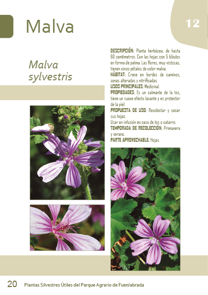 DESCRIPCIÓN: Planta herbácea, de hasta 60 centímetros. Con las hojas con 5 lóbulos en forma de palma. Las flores, muy vistosas, tienen cinco pétalos de color malva. HÁBITAT: Crece en bordes de caminos, zonas alteradas y nitrificadas.